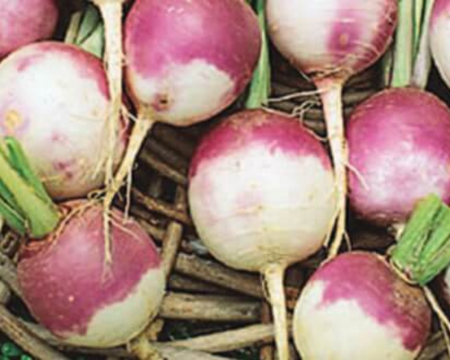 About Purple Top White Globe Turnips |The country’s most popular variety due to its crisp, sweetly mild white flesh. Roots are nearly round, smooth, purplish-red above the soil line and white below. Roots can get 6-in. or more across, but are best when harvested at recommended size or less. Large, lobed greens. Frost enhances flavor. Good keeper.